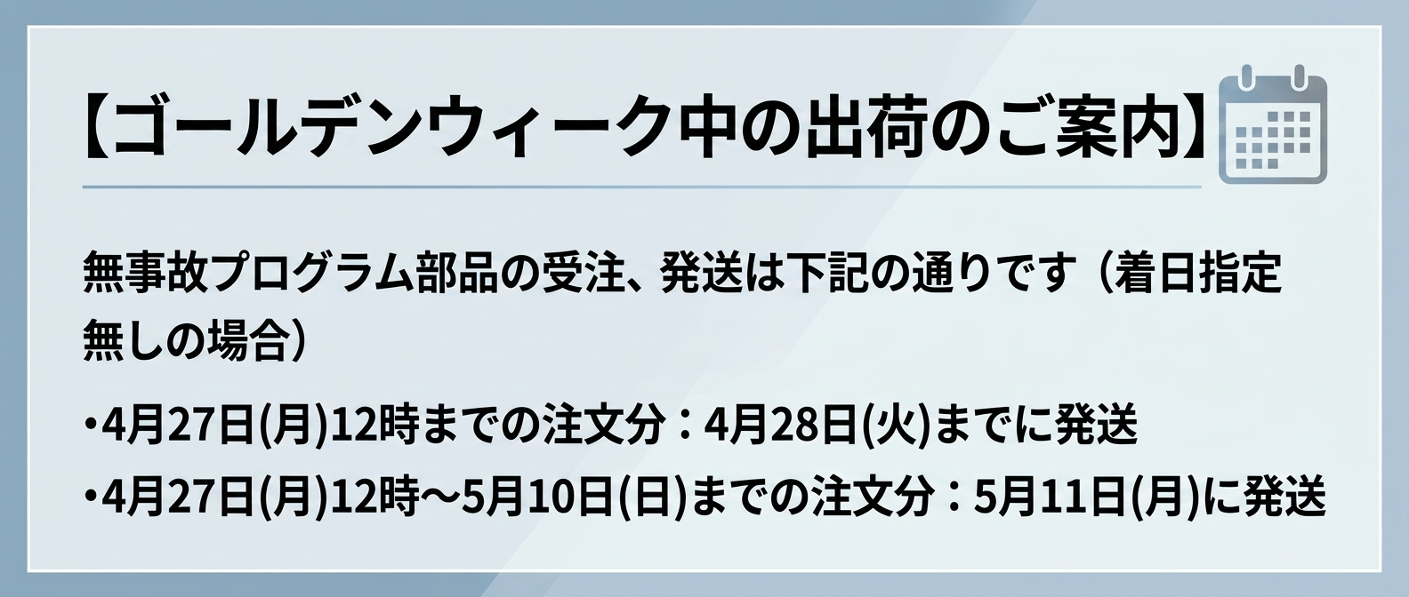 無事故プログラム部品の受注、発送は下記の通りです(着日指定無しの場合)